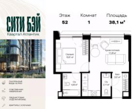 Продаётся 1-комнатная квартира общей площадью 38.08 м² с предчистовой отделкой в ЖК Сити Бэй на 52-м этаже 53 этажного дома.