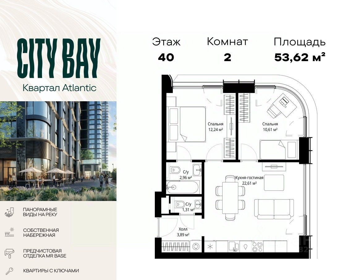 Продаётся 2-комнатная квартира общей площадью 53.62 м² с предчистовой отделкой в ЖК Сити Бэй на 40-м этаже 53 этажного дома.