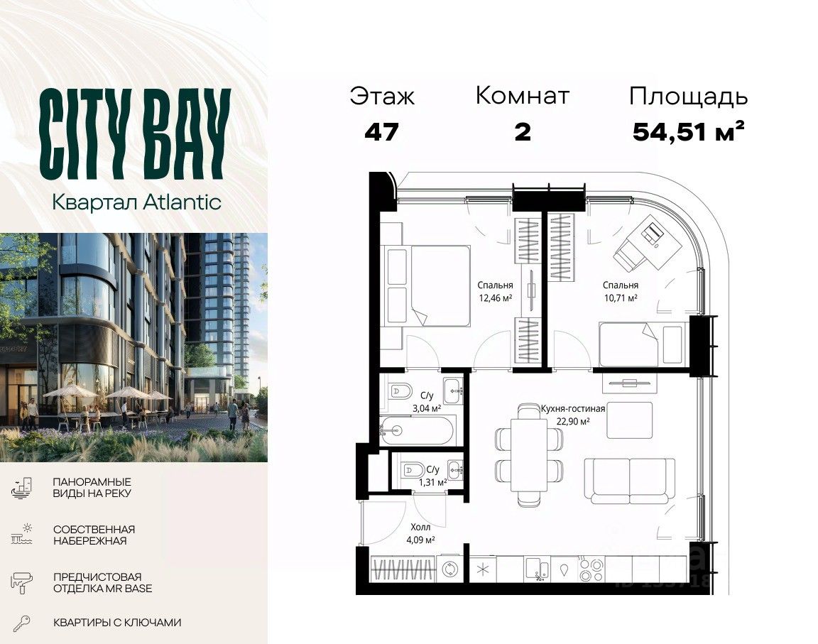 Продаётся 2-комнатная квартира общей площадью 54.51 м² с предчистовой отделкой в ЖК City Вау на 47-м этаже 53 этажного дома.
