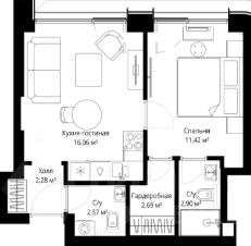 Продаётся 1-комнатная квартира общей площадью 37.92 м² с предчистовой отделкой в ЖК City Вау на 22-м этаже 53 этажного дома.
