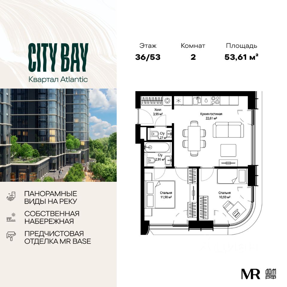Продаётся 2-к квартира общей площадью 53.61 м² с предчистовой отделкой в ЖК City Вау на 36-м этаже 53 этажного дома.