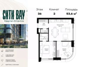 Продаётся 2-комнатная квартира общей площадью 53.61 м² с предчистовой отделкой в ЖК Сити Бэй на 36-м этаже 53 этажного дома.