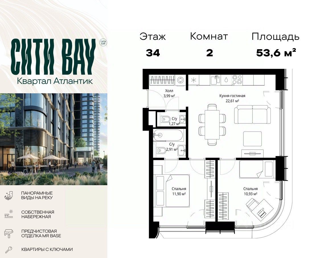 Продаётся 2-комнатная квартира общей площадью 53.61 м² с предчистовой отделкой в ЖК Сити Бэй на 34-м этаже 53 этажного дома.
