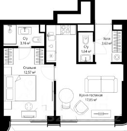Продаётся 1-комнатная квартира общей площадью 38.85 м² с предчистовой отделкой в ЖК City Вау на 34-м этаже 53 этажного дома.