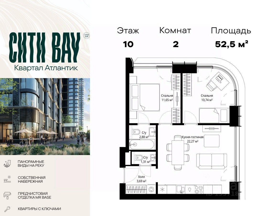 Продаётся 2-комнатная квартира общей площадью 52.54 м² с предчистовой отделкой в ЖК Сити Бэй на 10-м этаже 53 этажного дома.
