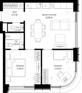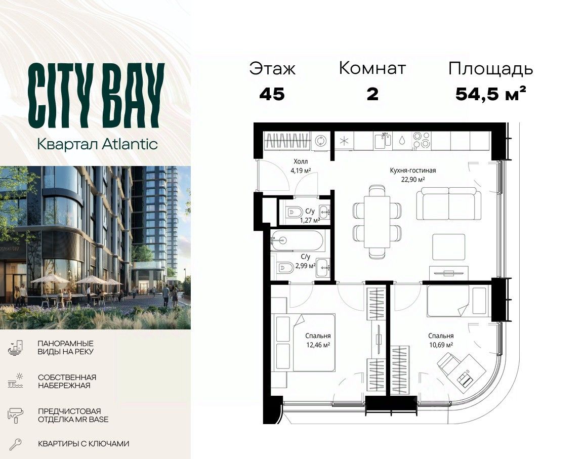 Продаётся 2-комнатная квартира общей площадью 54.50 м² с предчистовой отделкой в ЖК City Вау на 45-м этаже 53 этажного дома.
