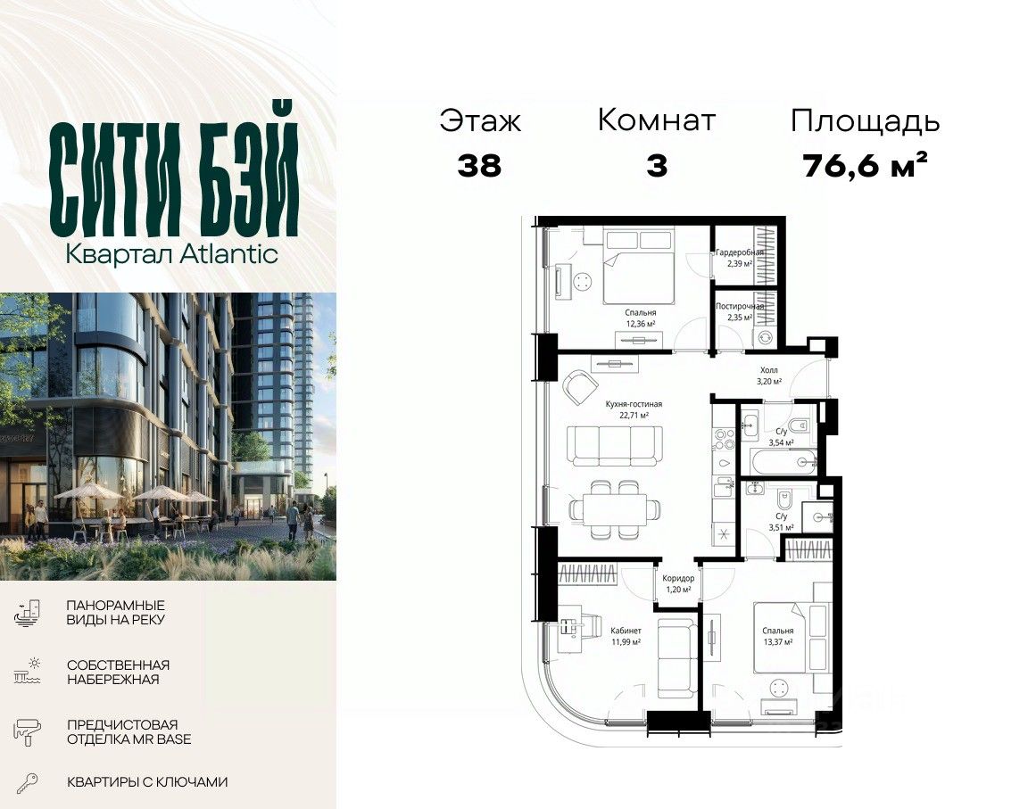 Продаётся 3-комнатная квартира общей площадью 76.62 м² с предчистовой отделкой в ЖК Сити Бэй на 38-м этаже 53 этажного дома.