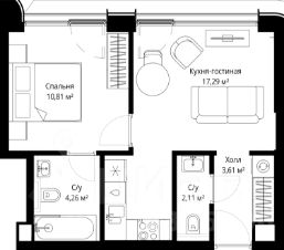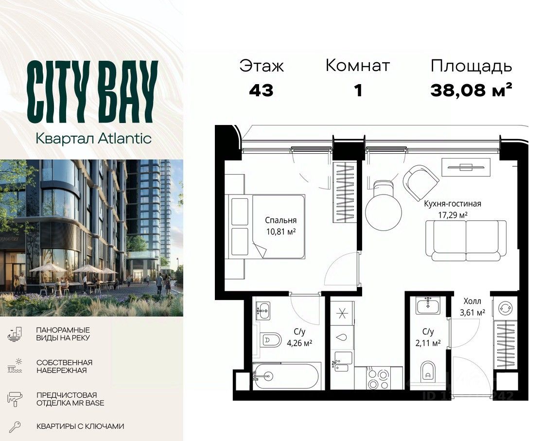 Продаётся 1-комнатная квартира общей площадью 38.08 м² с предчистовой отделкой в ЖК City Вау на 43-м этаже 53 этажного дома.