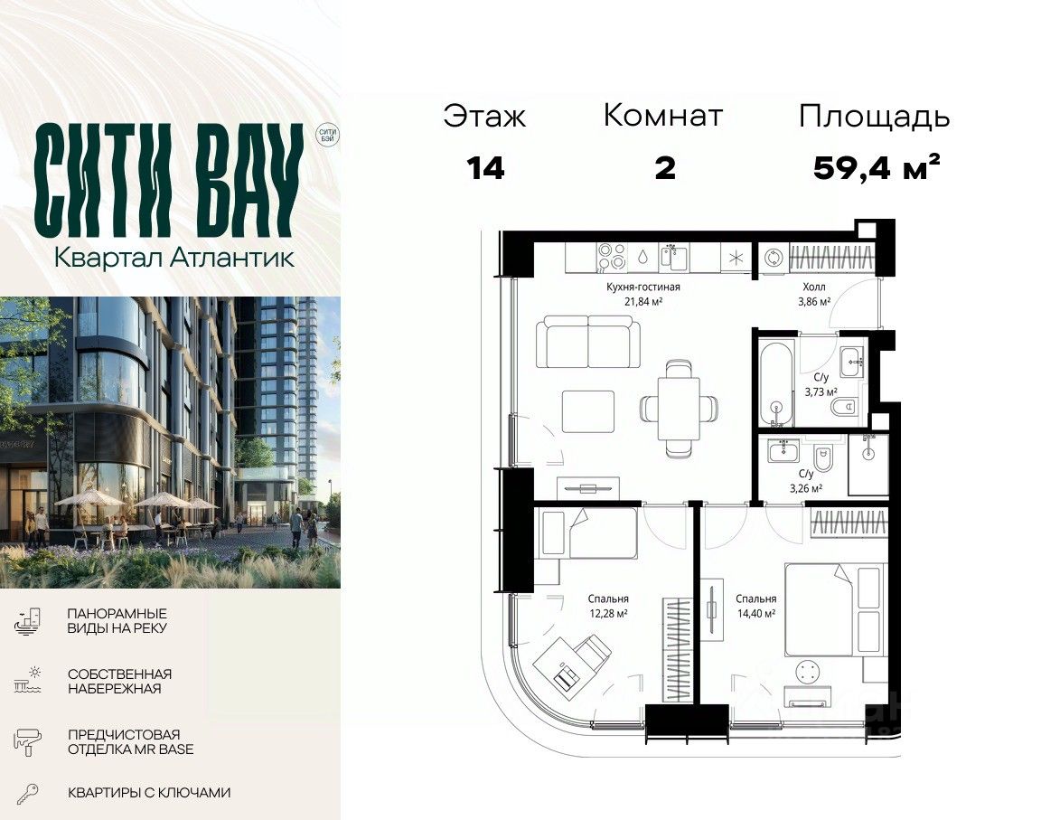 Продаётся 2-комнатная квартира общей площадью 59.37 м² с предчистовой отделкой в ЖК Сити Бэй на 14-м этаже 53 этажного дома.