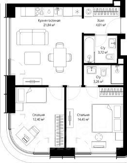 Продаётся 2-комнатная квартира общей площадью 59.68 м² с предчистовой отделкой в ЖК City Вау на 23-м этаже 53 этажного дома.