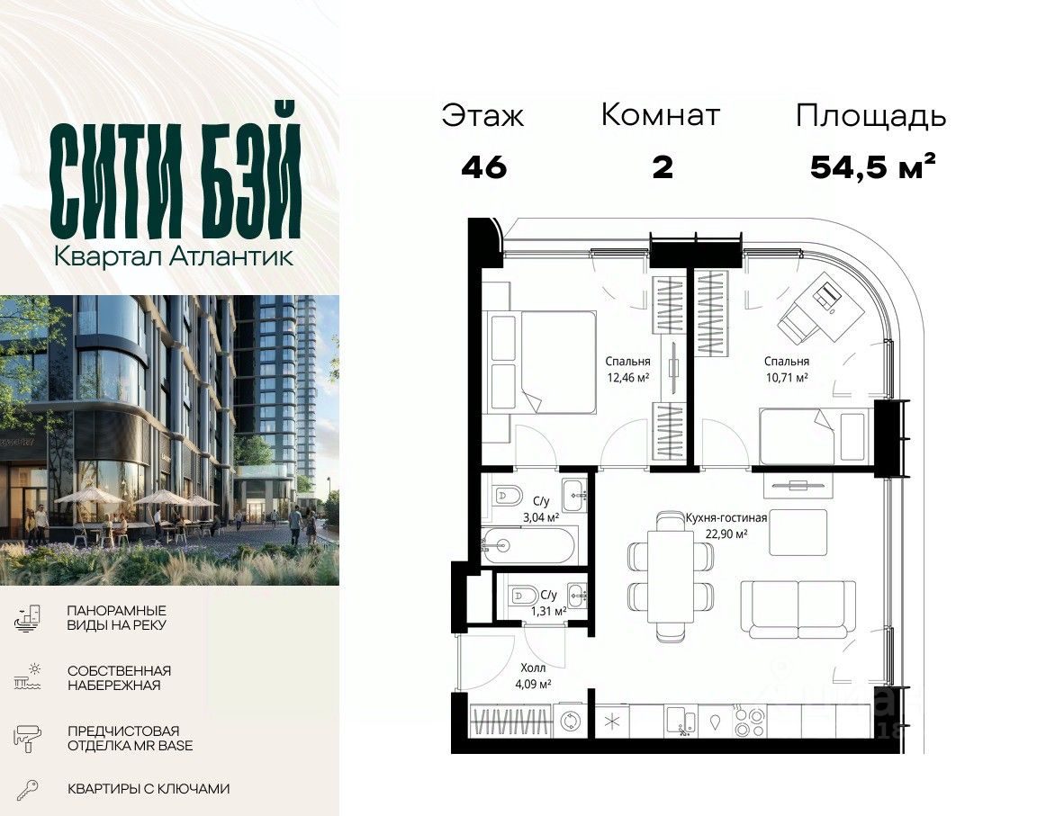 Продаётся 2-комнатная квартира общей площадью 54.51 м² с предчистовой отделкой в ЖК Сити Бэй на 46-м этаже 53 этажного дома.