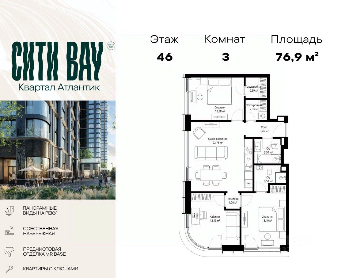 Продаётся 3-комнатная квартира общей площадью 76.94 м² с предчистовой отделкой в ЖК Сити Бэй на 46-м этаже 53 этажного дома.