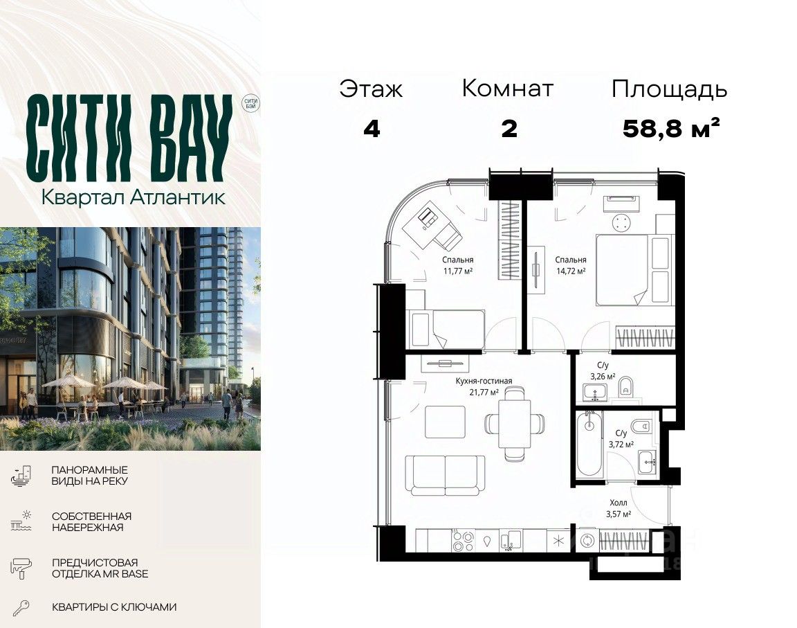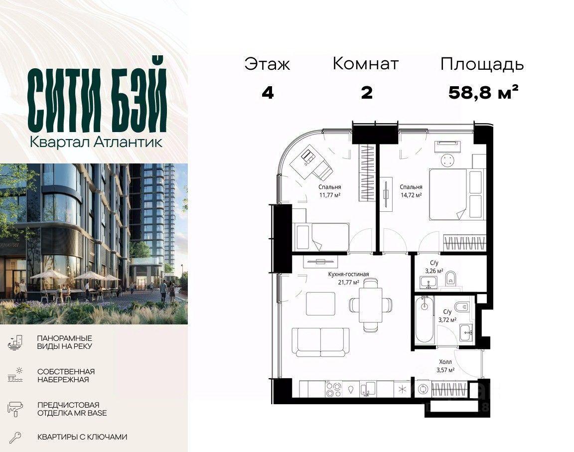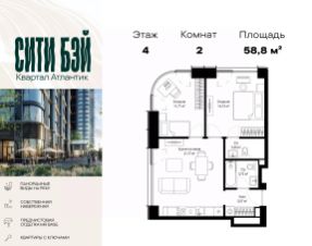 Продаётся 2-комнатная квартира общей площадью 58.81 м² с предчистовой отделкой в ЖК Сити Бэй на 4-м этаже 53 этажного дома.