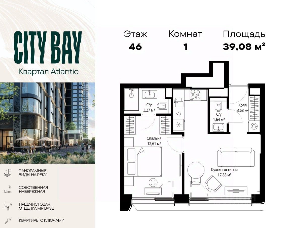 Продаётся 1-комнатная квартира общей площадью 39.08 м² с предчистовой отделкой в ЖК City Вау на 46-м этаже 53 этажного дома.