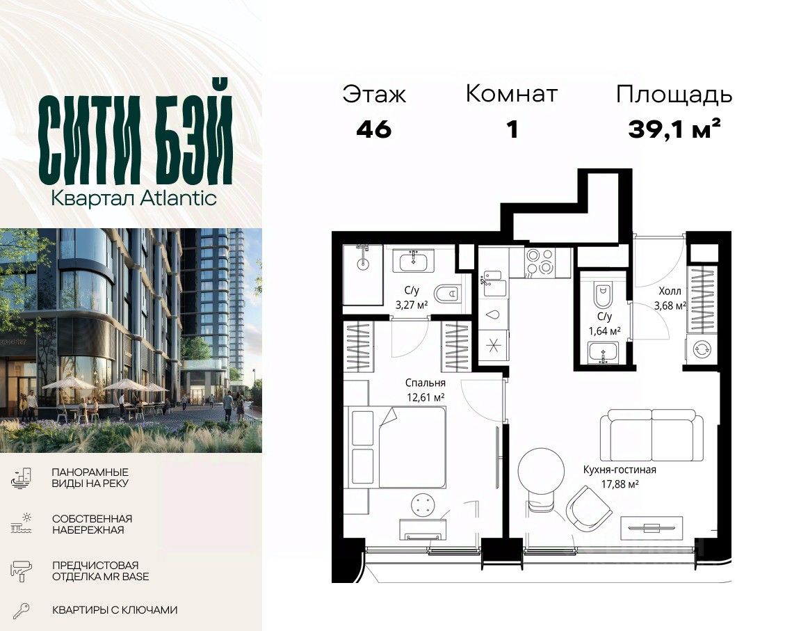 Продаётся 1-комнатная квартира общей площадью 39.08 м² с предчистовой отделкой в ЖК Сити Бэй на 46-м этаже 53 этажного дома.
