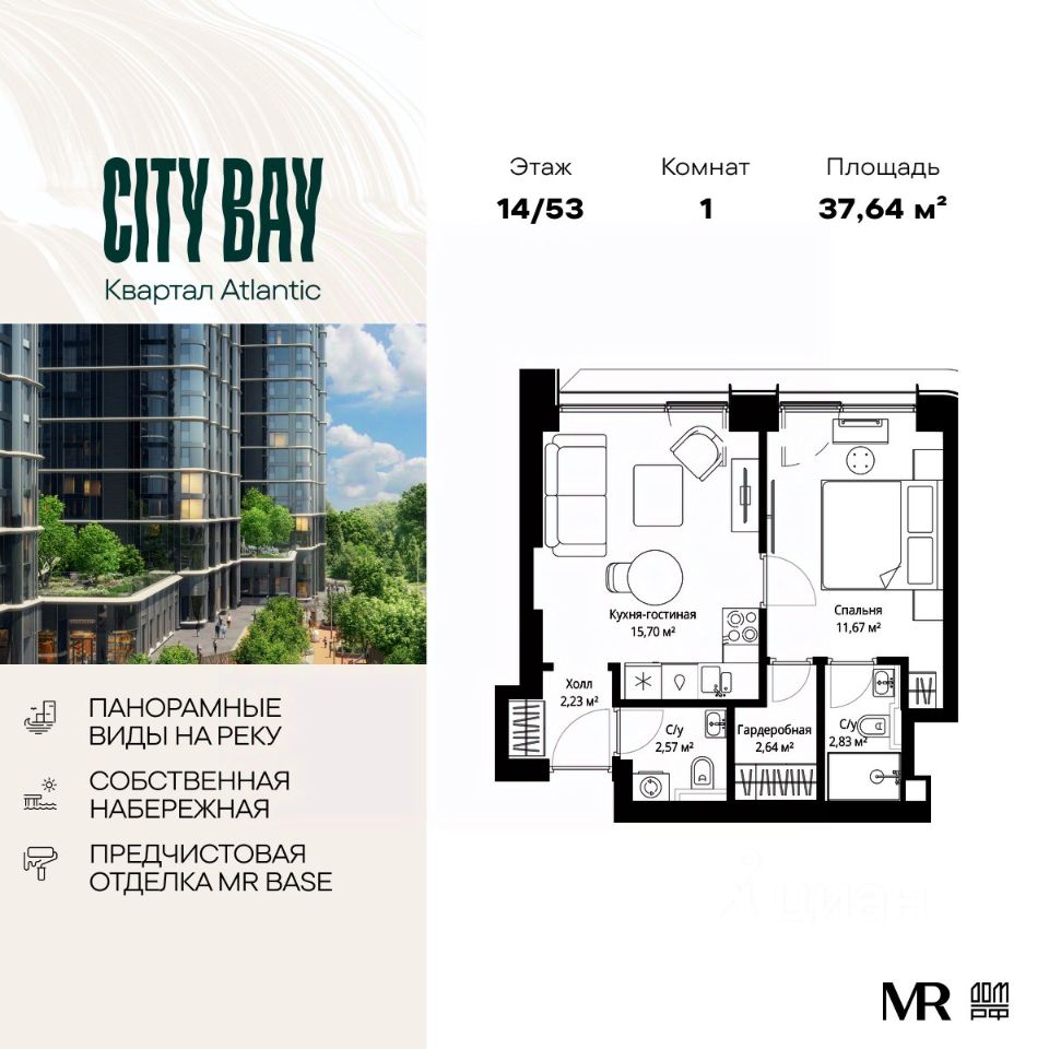 Продаётся 1-к квартира общей площадью 37.64 м² с предчистовой отделкой в ЖК City Вау на 14-м этаже 53 этажного дома.