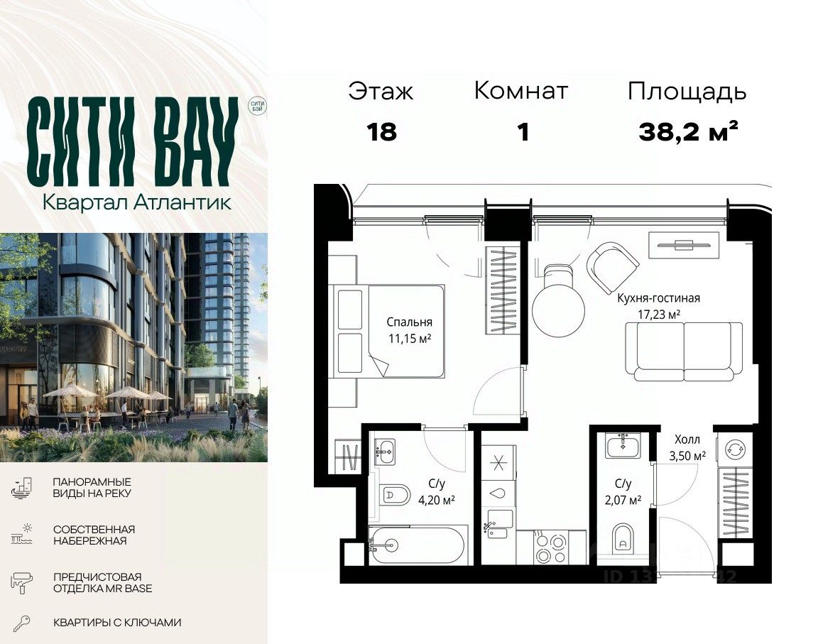 Продаётся 1-комнатная квартира общей площадью 38.15 м² с предчистовой отделкой в ЖК Сити Бэй на 18-м этаже 53 этажного дома.