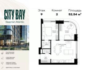 Продаётся 2-комнатная квартира общей площадью 52.54 м² с предчистовой отделкой в ЖК City Вау на 9-м этаже 53 этажного дома.