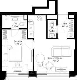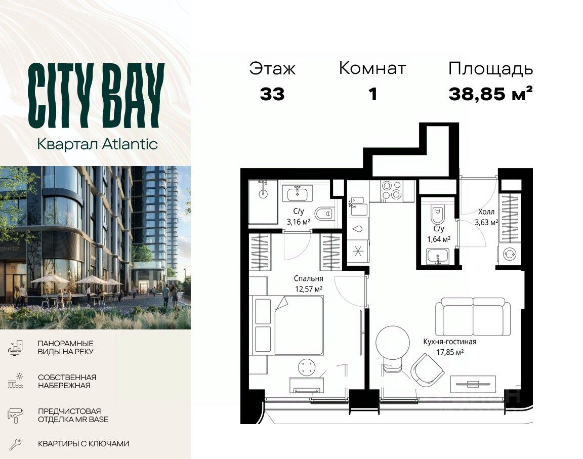 Продаётся 1-комнатная квартира общей площадью 38.85 м² с предчистовой отделкой в ЖК Сити Бэй на 33-м этаже 53 этажного дома.
