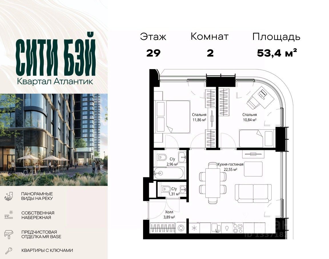 Продаётся 2-комнатная квартира общей площадью 53.41 м² с предчистовой отделкой в ЖК Сити Бэй на 29-м этаже 53 этажного дома.