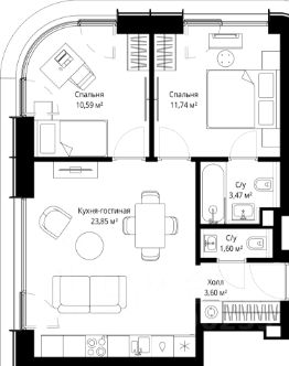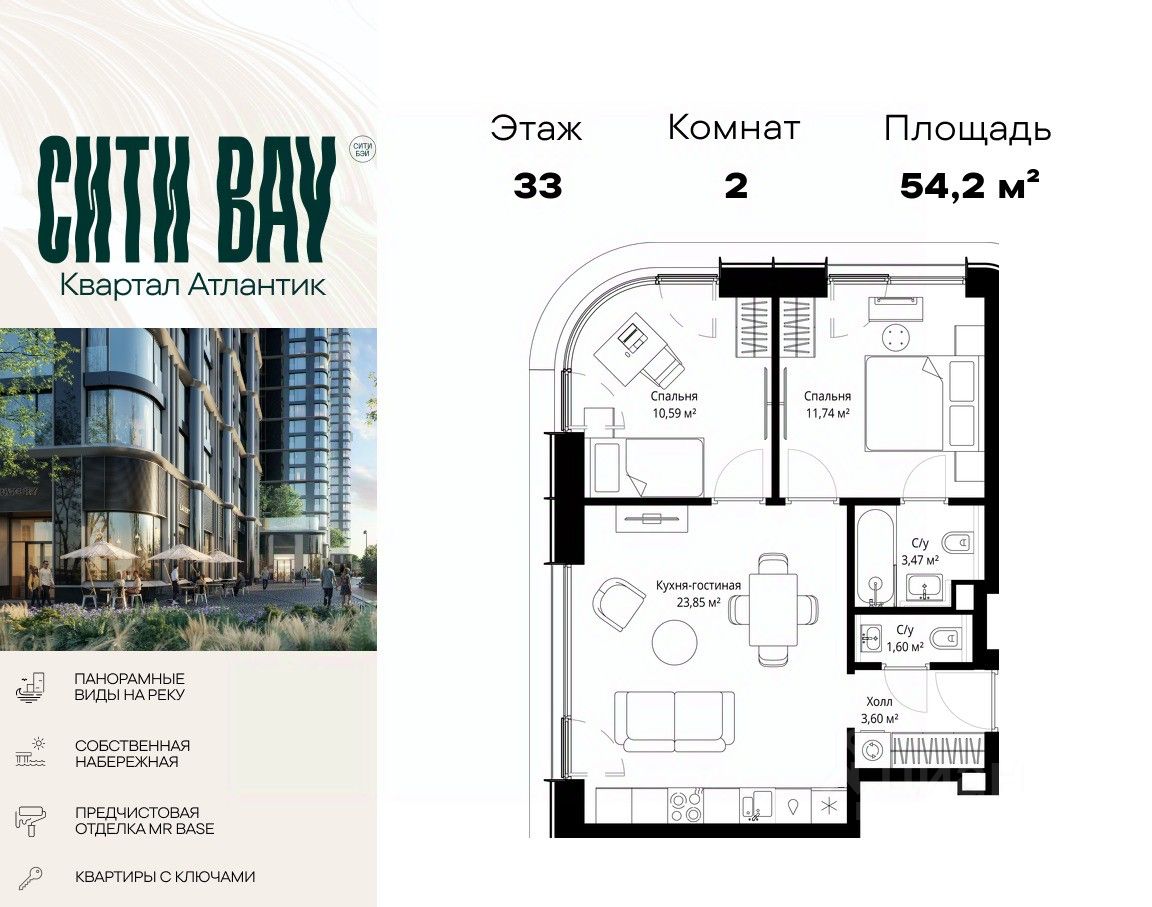 Продаётся 2-комнатная квартира общей площадью 54.20 м² с предчистовой отделкой в ЖК Сити Бэй на 33-м этаже 53 этажного дома.