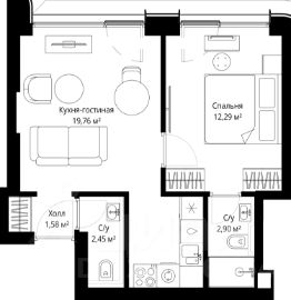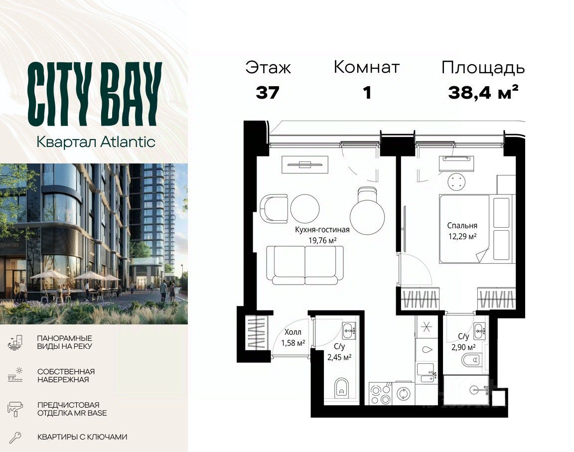 Продаётся 1-комнатная квартира общей площадью 38.40 м² с предчистовой отделкой в ЖК City Вау на 37-м этаже 53 этажного дома.