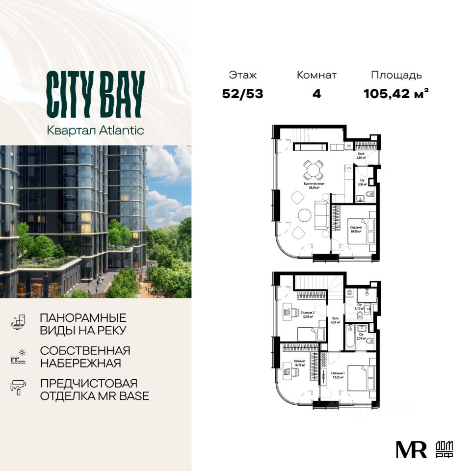 Продаётся 4-к квартира общей площадью 105.42 м² с предчистовой отделкой в ЖК City Вау на 52-м этаже 53 этажного дома.