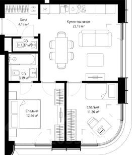 Продаётся 2-комнатная квартира общей площадью 55.40 м² с предчистовой отделкой в ЖК City Вау на 51-м этаже 53 этажного дома.