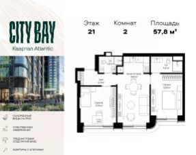 Продаётся 2-комнатная квартира общей площадью 57.80 м² с предчистовой отделкой в ЖК City Вау на 21-м этаже 53 этажного дома.