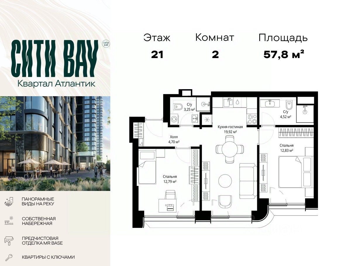 Продаётся 2-комнатная квартира общей площадью 57.80 м² с предчистовой отделкой в ЖК Сити Бэй на 21-м этаже 53 этажного дома.