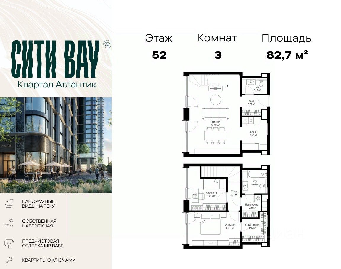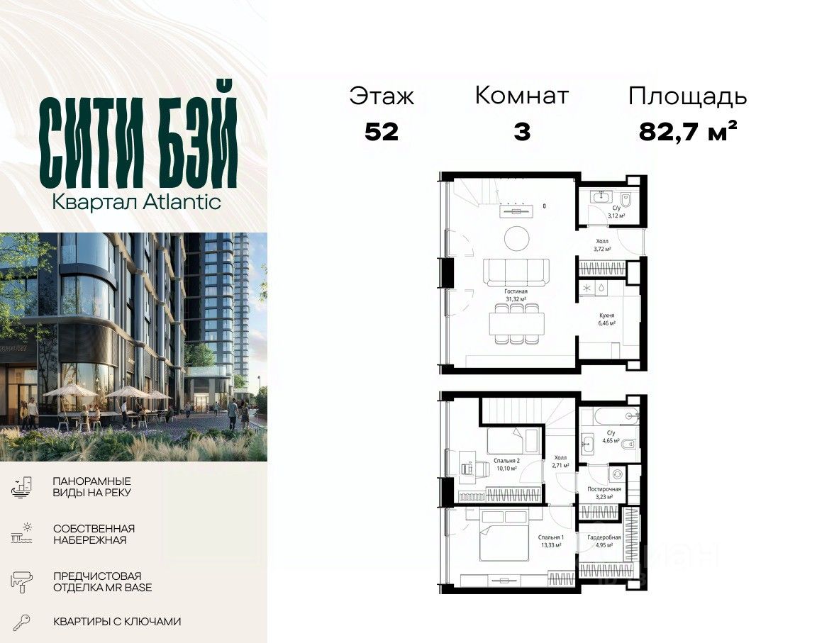 Продаётся 3-комнатная квартира общей площадью 82.70 м² с предчистовой отделкой в ЖК Сити Бэй на 52-м этаже 53 этажного дома.