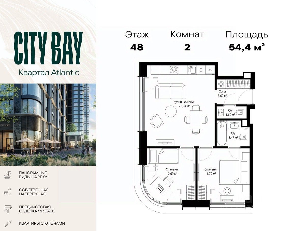 Продаётся 2-комнатная квартира общей площадью 54.40 м² с предчистовой отделкой в ЖК City Вау на 48-м этаже 53 этажного дома.