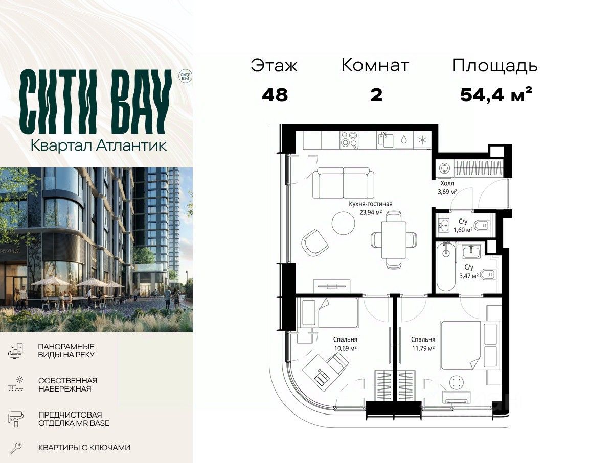 Продаётся 2-комнатная квартира общей площадью 54.40 м² с предчистовой отделкой в ЖК Сити Бэй на 48-м этаже 53 этажного дома.