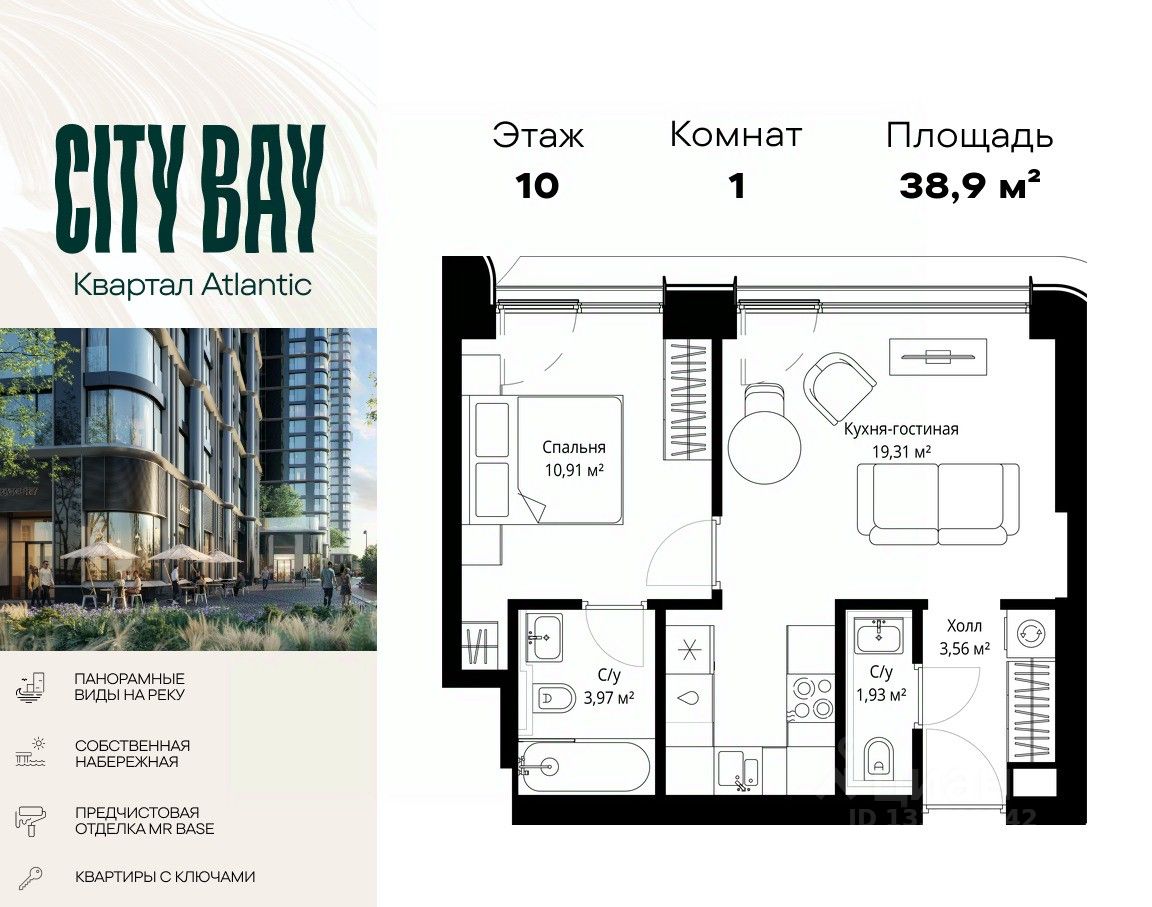Продаётся 1-комнатная квартира общей площадью 38.90 м² с предчистовой отделкой в ЖК City Вау на 10-м этаже 53 этажного дома.