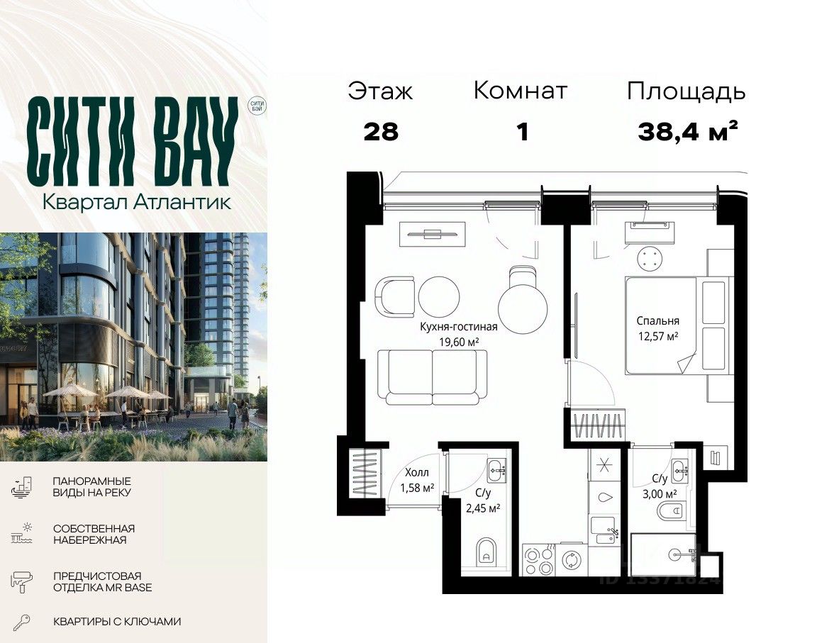 Продаётся 1-комнатная квартира общей площадью 38.40 м² с предчистовой отделкой в ЖК Сити Бэй на 28-м этаже 53 этажного дома.