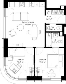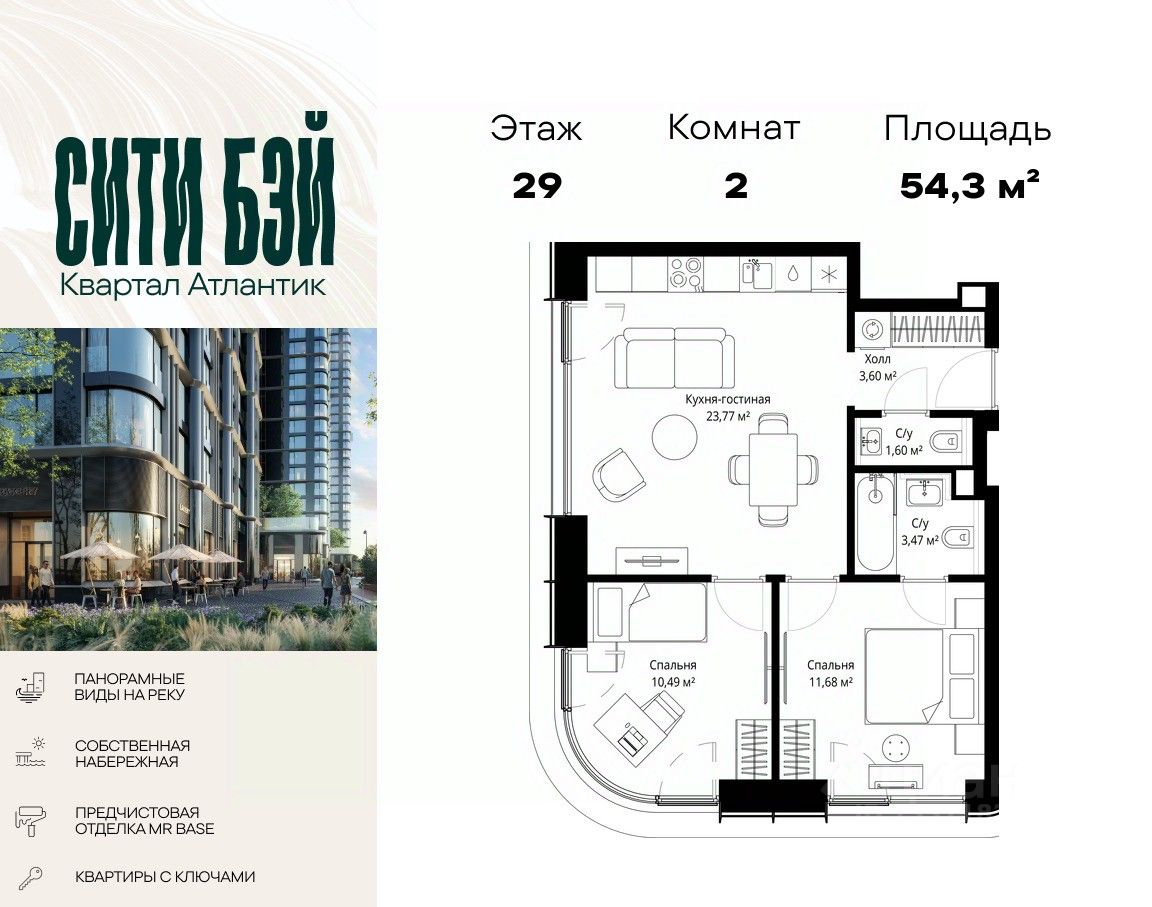Продаётся 2-комнатная квартира общей площадью 54.30 м² с предчистовой отделкой в ЖК Сити Бэй на 29-м этаже 53 этажного дома.
