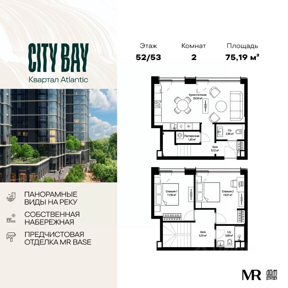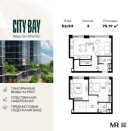Продаётся 2-к квартира общей площадью 75.19 м² с предчистовой отделкой в ЖК City Вау на 52-м этаже 53 этажного дома.