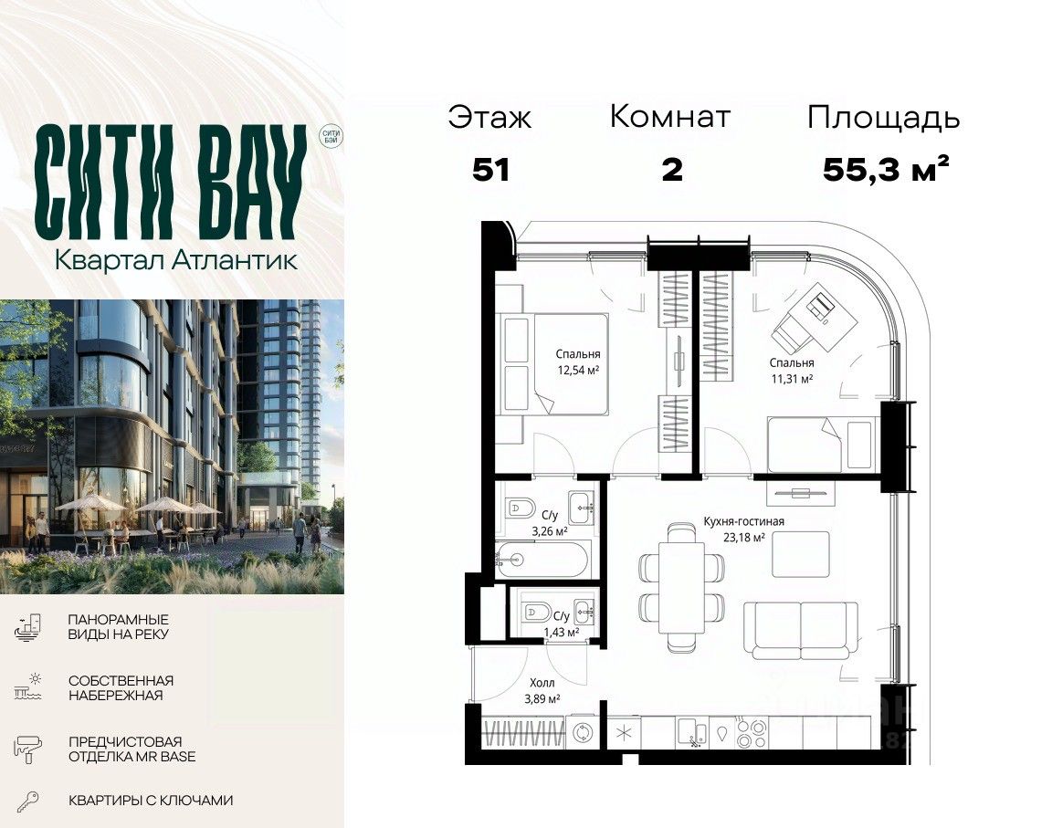 Продаётся 2-комнатная квартира общей площадью 55.30 м² с предчистовой отделкой в ЖК Сити Бэй на 51-м этаже 53 этажного дома.
