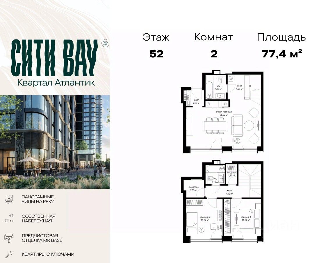 Продаётся 2-комнатная квартира общей площадью 77.40 м² с предчистовой отделкой в ЖК Сити Бэй на 52-м этаже 53 этажного дома.