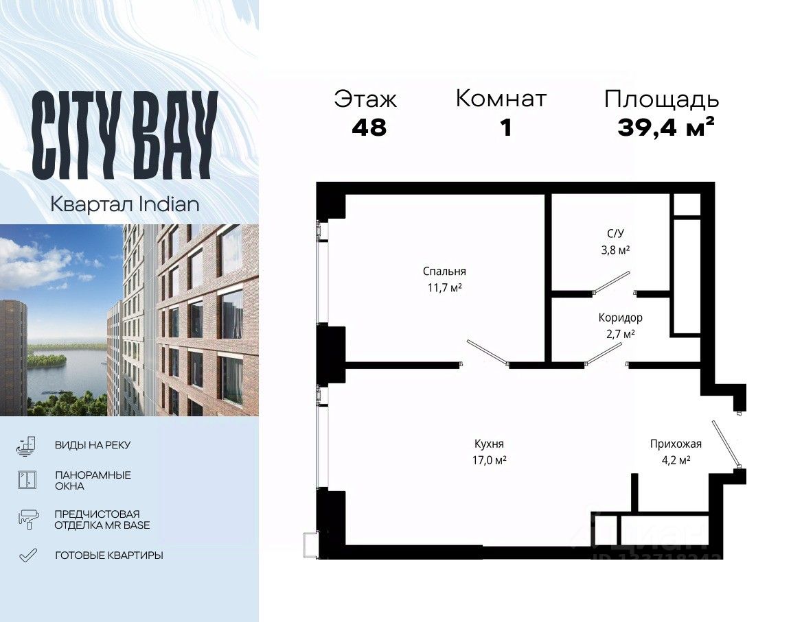 Продаётся 1-комнатная квартира общей площадью 39.40 м² с предчистовой отделкой в ЖК City Вау на 48-м этаже 52 этажного дома.