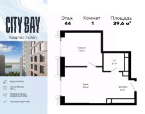 Продаётся 1-комнатная квартира общей площадью 39.60 м² с предчистовой отделкой в ЖК City Вау на 44-м этаже 52 этажного дома.