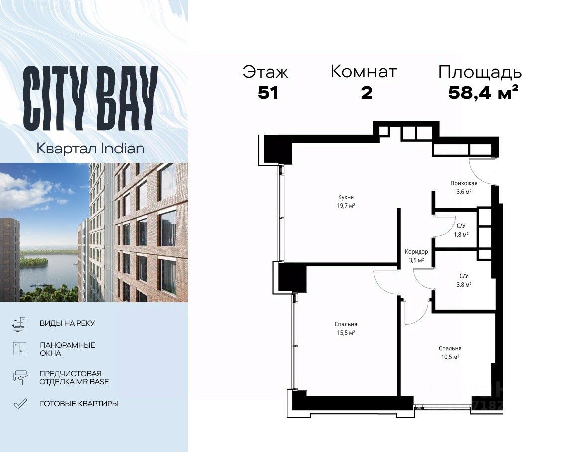 Продаётся 2-комнатная квартира общей площадью 58.40 м² с предчистовой отделкой в ЖК City Вау на 51-м этаже 52 этажного дома.