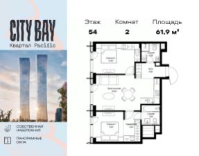 Продаётся 2-комнатная квартира общей площадью 61.90 м² без отделки в ЖК City Вау, квартале Pacific, на 54-м этаже 56 этажного дома.