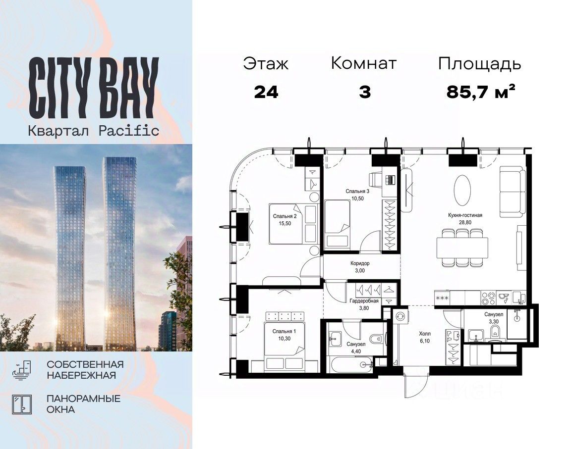 Продаётся 3-комнатная квартира общей площадью 85.70 м² без отделки в ЖК City Вау, квартале Pacific, на 24-м этаже 26 этажного дома.