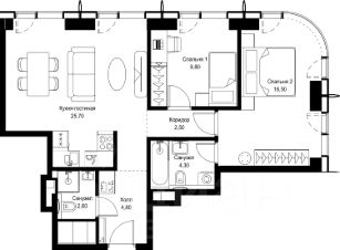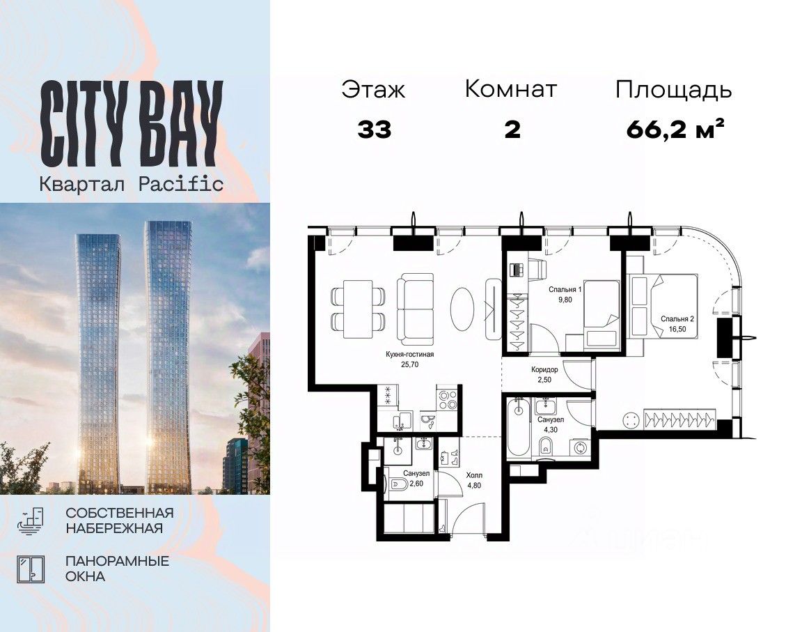 Продаётся 2-комнатная квартира общей площадью 66.20 м² без отделки в ЖК Сити Бэй, квартале Pacific, на 33-м этаже 59 этажного дома.