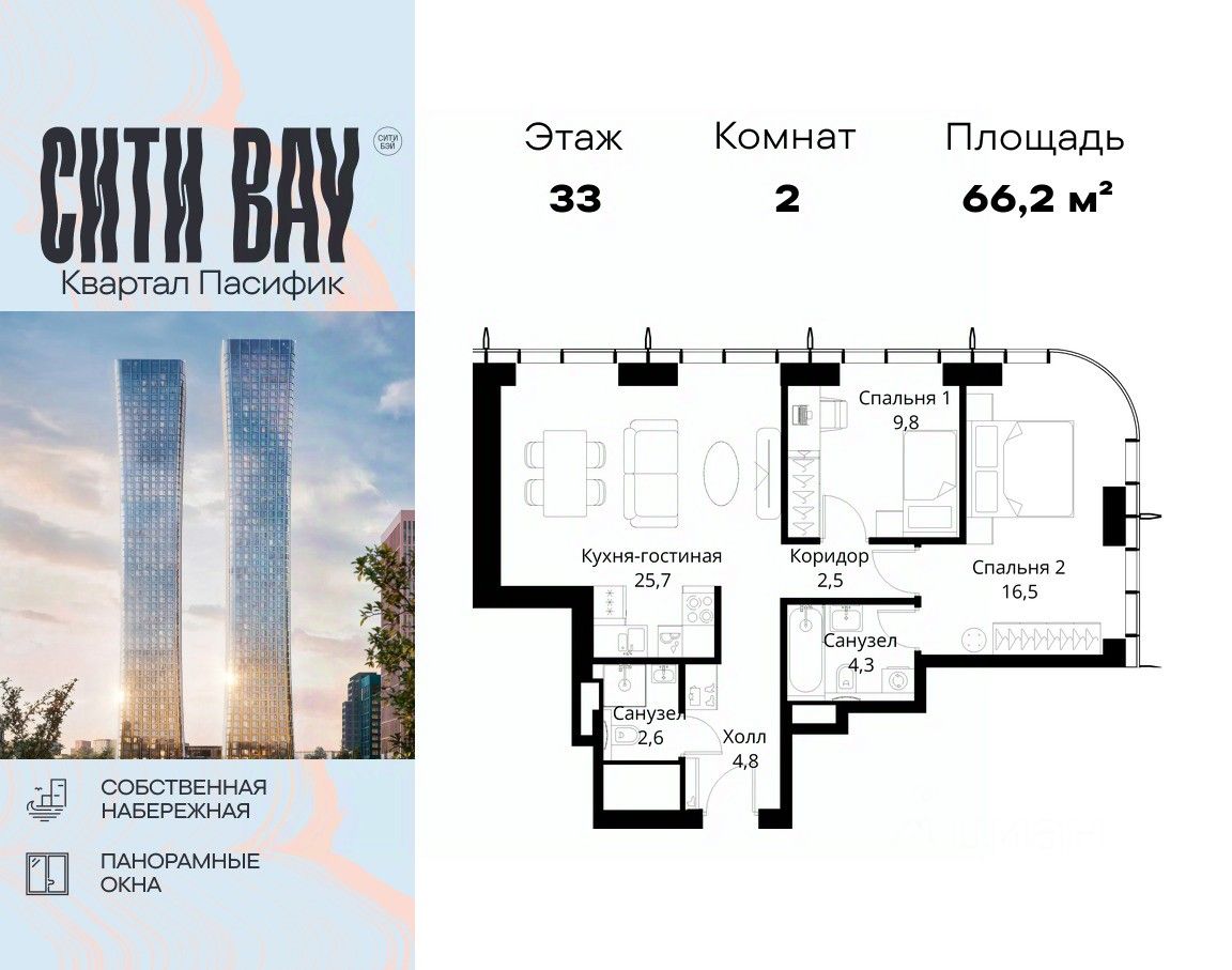 Продаётся 2-комнатная квартира общей площадью 66.20 м² без отделки в ЖК Сити Бэй, квартале Пасифик, на 33-м этаже 59 этажного дома.