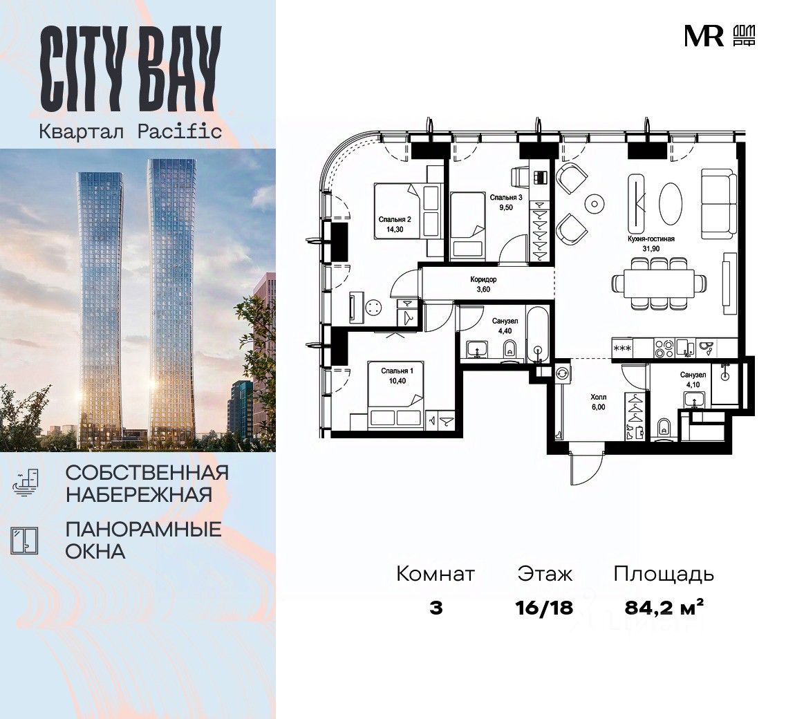 Продаётся 3-к квартира общей площадью 84.20 м² без отделки в ЖК City Вау, квартале Pacific, на 16-м этаже 18 этажного дома.