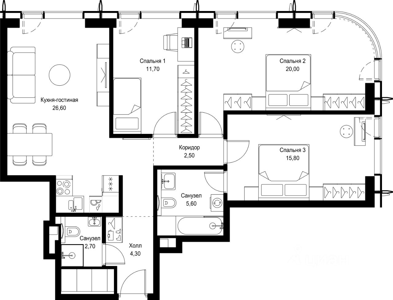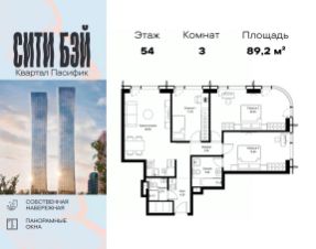 Продаётся 3-комнатная квартира общей площадью 89.20 м² без отделки в ЖК Сити Бэй, квартале Пасифик, на 54-м этаже 59 этажного дома.