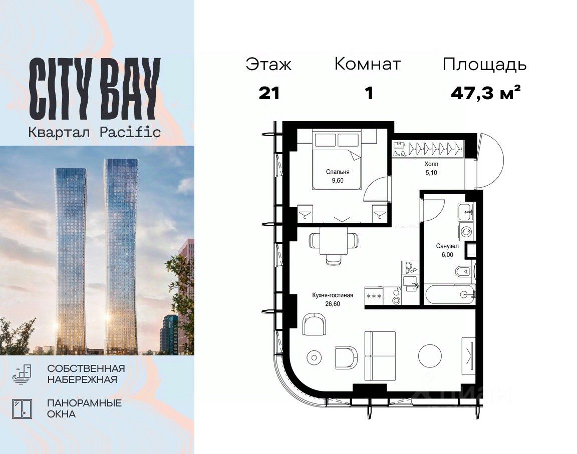 Продаётся 1-комнатная квартира общей площадью 47.30 м² без отделки в ЖК City Вау, квартале Pacific, на 21-м этаже 23 этажного дома.