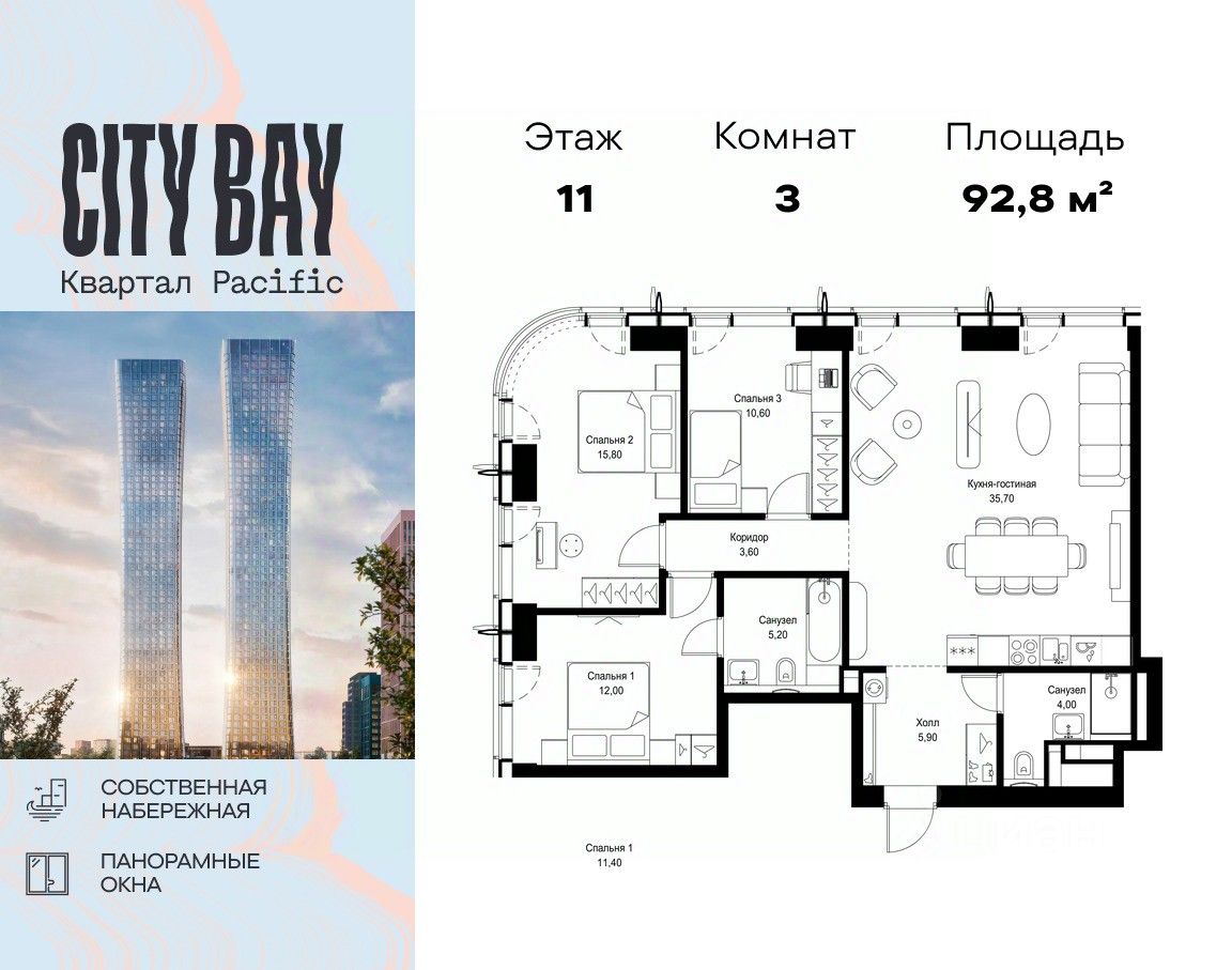 Продаётся 3-комнатная квартира общей площадью 92.80 м² без отделки в ЖК City Вау, квартале Pacific, на 11-м этаже 13 этажного дома.